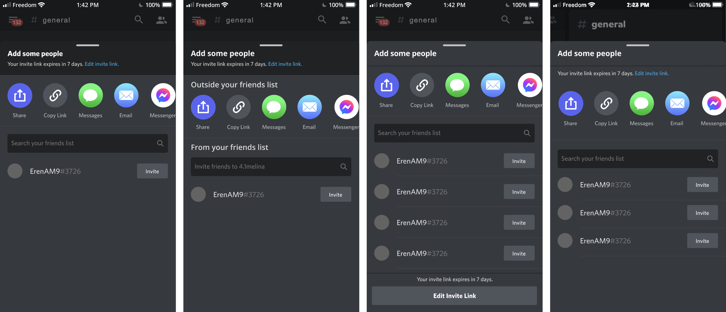 I created mock-ups of redesigns to visualize potential solutions to the issues found during the evaluation. In particular, I tried to pay attention to the hierarchy of the information displayed on the screen and how it communicates functionality to the user. On this screen I played around with the position and format of the “Edit invite link” functionality and the copy on the screen, drawing inspiration from other popular apps the desktop version of Discord.